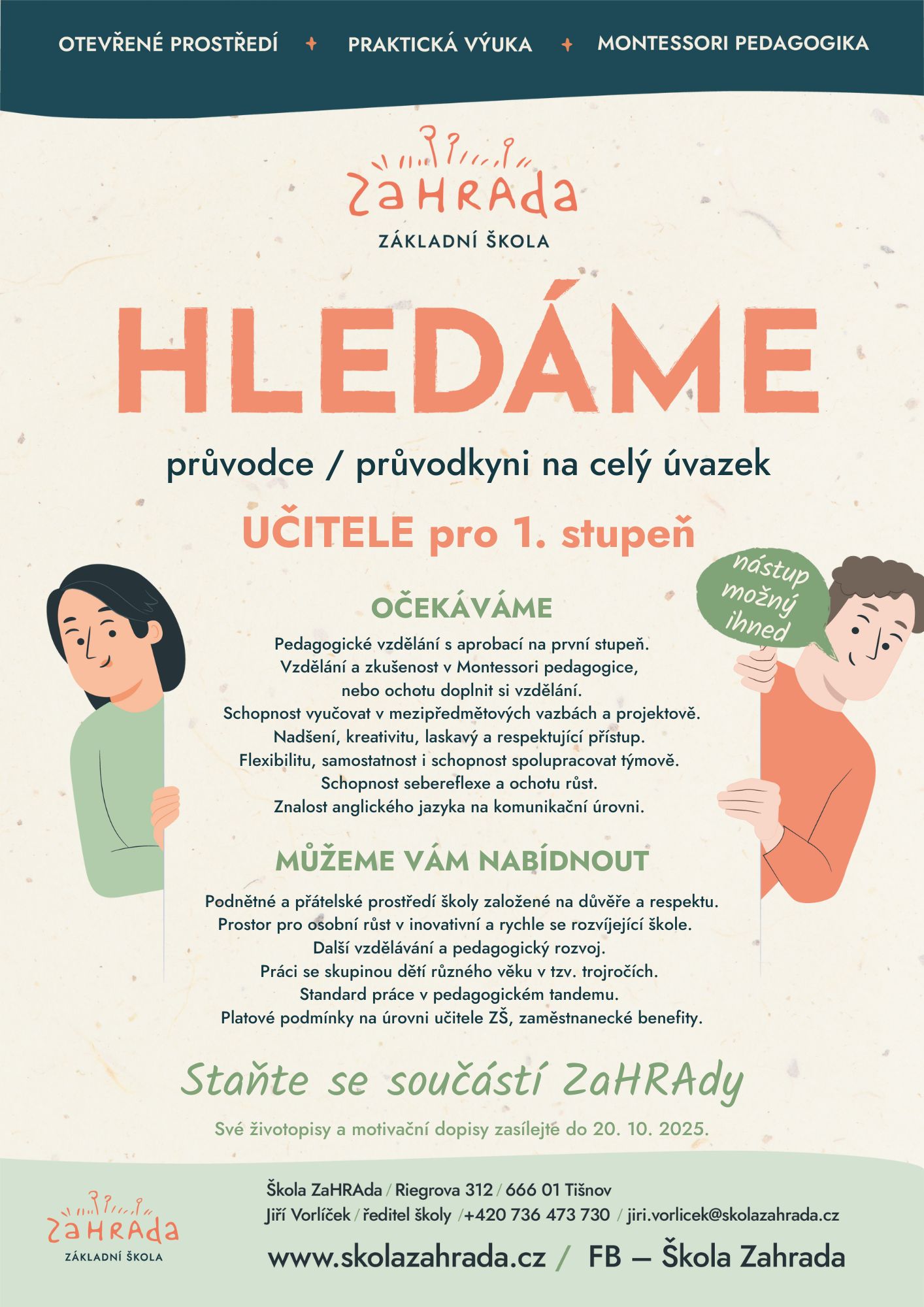 Nabízíme nadstandardní podmínky pro rozvoj našich průvodců, podporu ve vzdělávání, zajištění technologií i odbornou spolupráci. Rosteme společně tím, že sdílíme své zkušenosti, zajišťujeme si vlastní supervize v Montessori i formativním přístupu k učení, budujeme interní leadership. Jsme progresivní škola, která roste, a hledá nové kolegyně a kolegy.